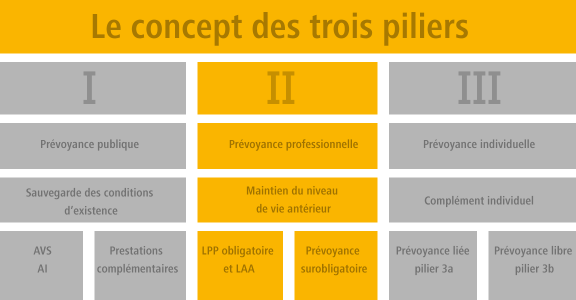 En Suisse, le système de prévoyance repose sur le «principe des trois piliers», ancré depuis 1972 dans la Constitution fédérale. Ce système vise à garantir une couverture de risque financière en cas de décès, d’invalidité et de vieillesse.